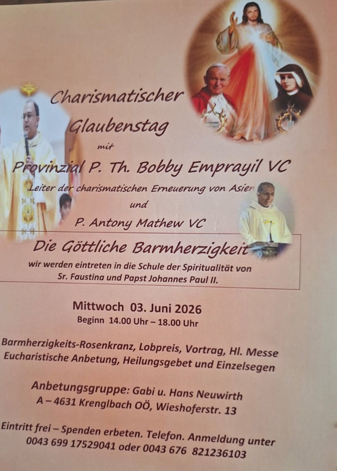 Barmherzigkeits-Rosenkranz, Lobpreis, Vortrag, Hl. Messe, Eucharistische Anbetung, Heilungsgebet u. Einzelsegen